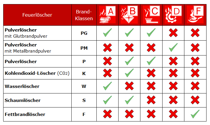Einen Pulverlöscher kann man je nach Pulver bei den Brandklassen A, B und C einsetzen. Er hat zwar die größte Löschkraft, allerdings zieht die